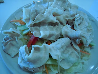 This salad is steamed julienned cabbage, steamed bean sprouts, julienned carrots, cucumbers, and red bell pepper topped with the thin cuts of pork belly that has been quickly blanched in hot water (similar to a shabu-shabu). The first time I saw cold pork I didn't think it would be appetizing but when served with all of these vegetables and the banbanji sauce it is delicious.